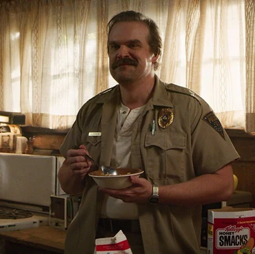 “Hopper rubbing Mike’s back—assuring him it’s going to be okay. They both visibly look upset—eventually, Hopper walks away, leaving Mike staring blankly for a while.”