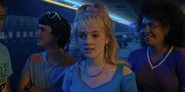A surprised Jake watching Angela fall to the ground by an enraged Eleven striking her in the face with a roller skate.