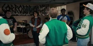 Two days later, on March 23, Jeff, Gareth and Freak 1 were playing music in one of their garages as part of their band Corroded Coffin. They were approached by basketball players Jason, Andy, Patrick, and Lucas, who demanded to know Eddie's location. After being asked if he knew "these freaks", Lucas replied "they know my sister", and went on to call the Hellfire Club a "club or cult", trying to act cool to blend in with the jocks. Jeff understandably took offense to this, saying "Lucas, what the hell?". Lucas, who was waiting for the right moment to do the right thing (which he later did, leading the jocks to a false location and running away to buy Eddie time), responded "We're just trying to find Eddie, man". Jason ended up getting a clue from Gareth, and the basketball players left the band players.